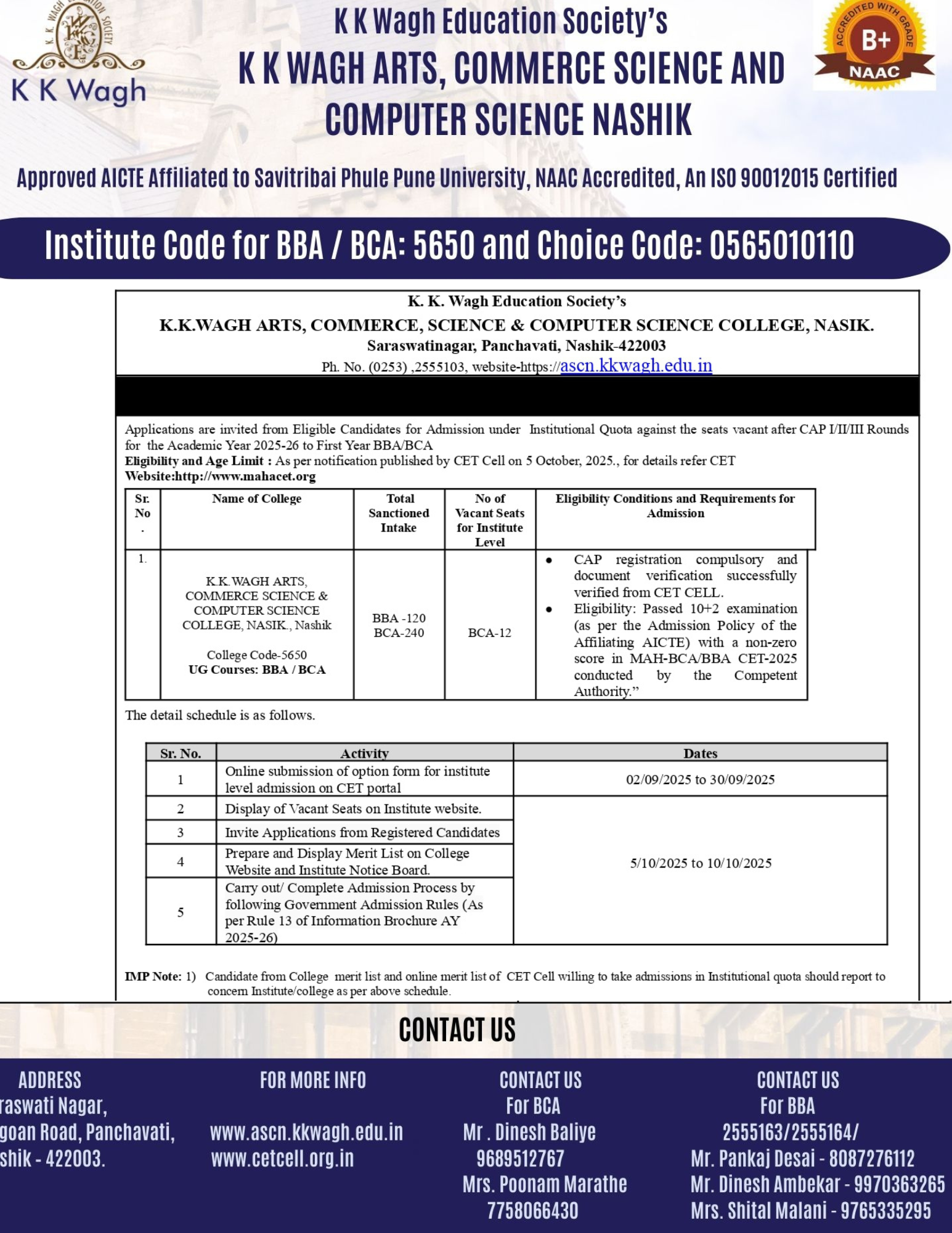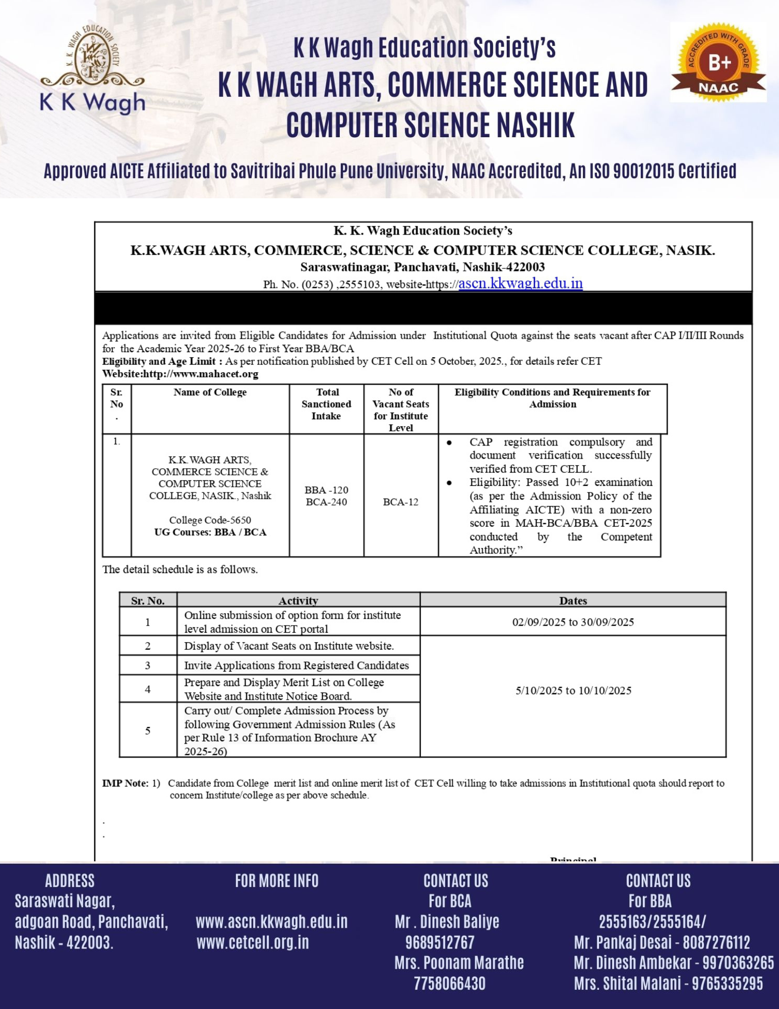 A small sapling planted by K.K. Wagh Senior College has grown into a big tree with having over 20,000 students engaged in studies from BBA,BBA(CA),Commerce,Computer Science and Science. There are dedicated employees following the Indian ethics and striving hard towards developing the World best Alumni.