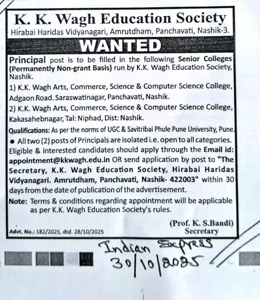 Job opening in K. K. Wagh Education Society.